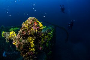 Wrak statku obrośnięty różnymi formami zwierząt osiadłych
